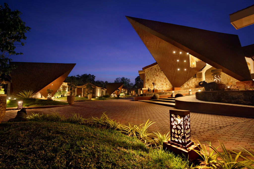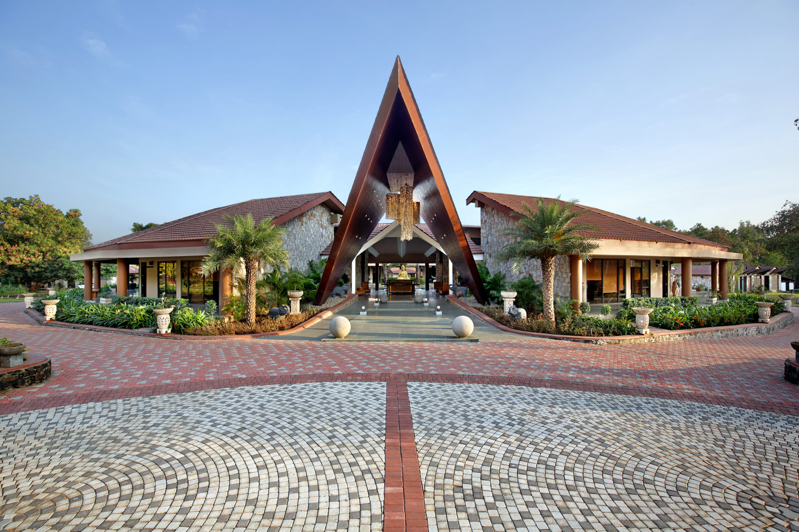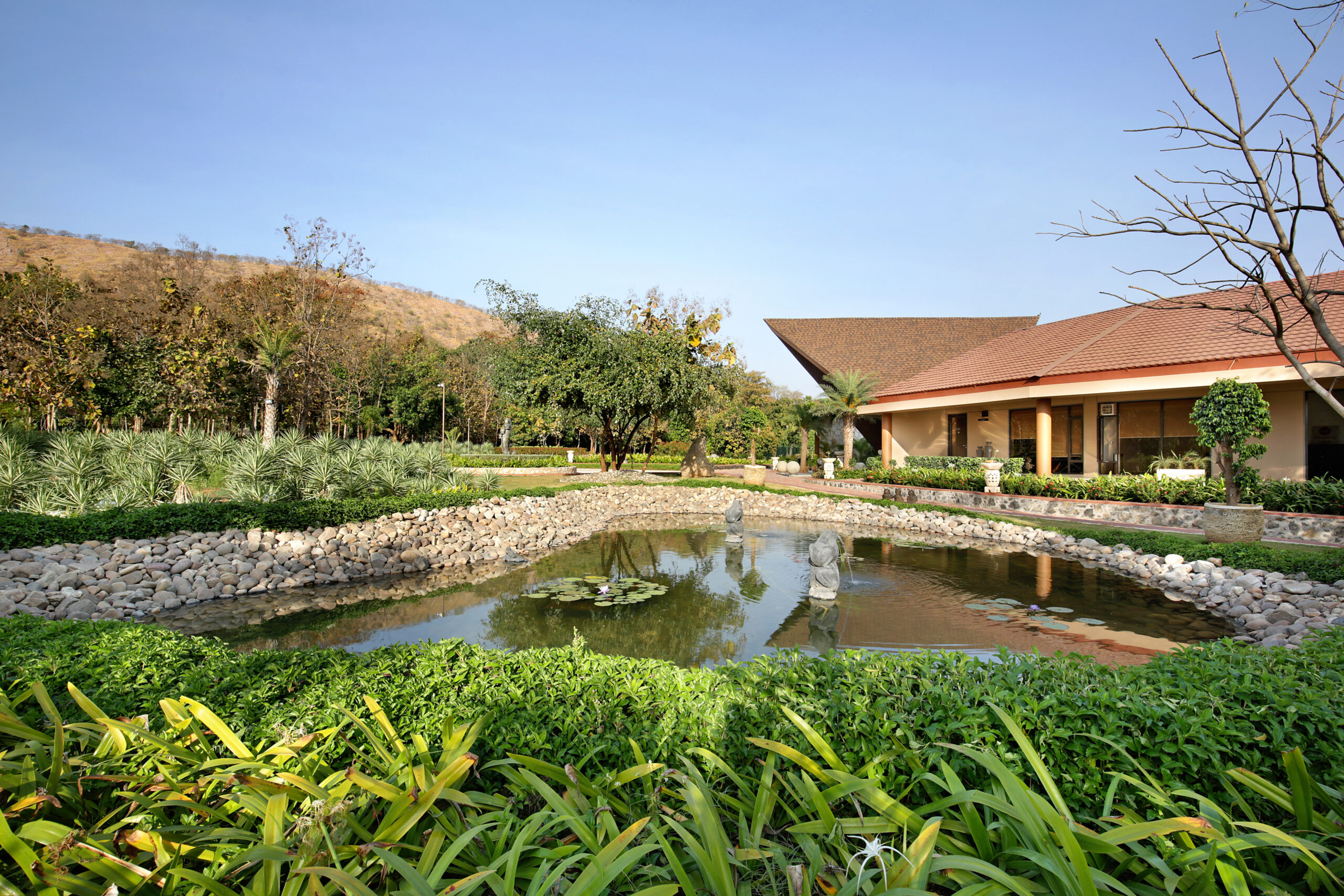 Located approximately 50 kilometres from Vadodara, the project sits within an untouched natural reserve near Jambughoda. The site is characterised by dense vegetation and large mature trees, which became the central inspiration for the design strategy. Rather than imposing a rigid built form on the landscape, the architecture was conceived as an organic extension of the natural terrain. The availability of a large site allowed the designers to dedicate nearly 550,000 sq. ft. to landscaping, significantly exceeding the built-up area and reinforcing the therapeutic relationship between architecture and nature.