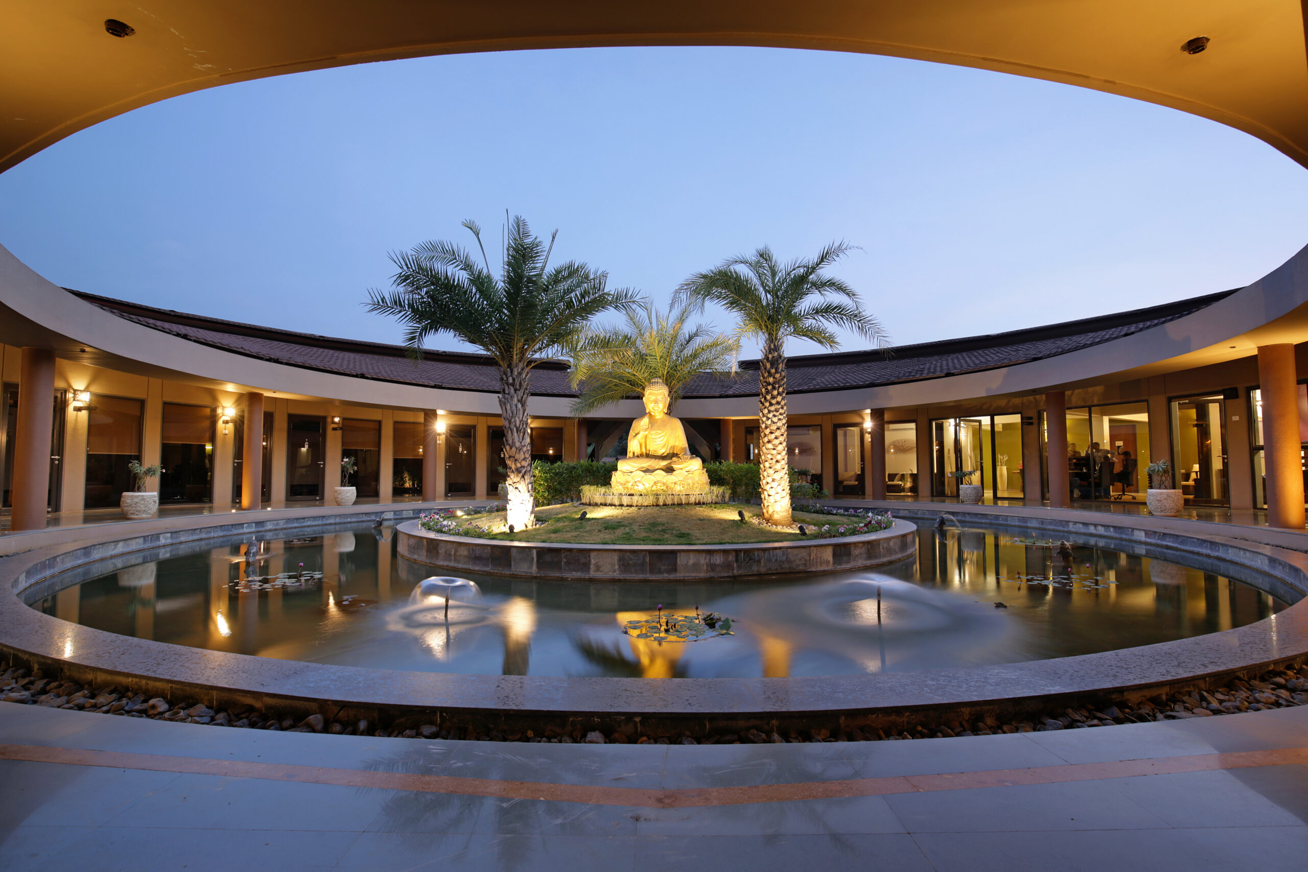 The building itself follows a circular form organised around an open-to-sky courtyard, creating a calm internal environment that allows natural light and ventilation to penetrate deep into the structure. Two concentric wings define the spatial organisation of this building: