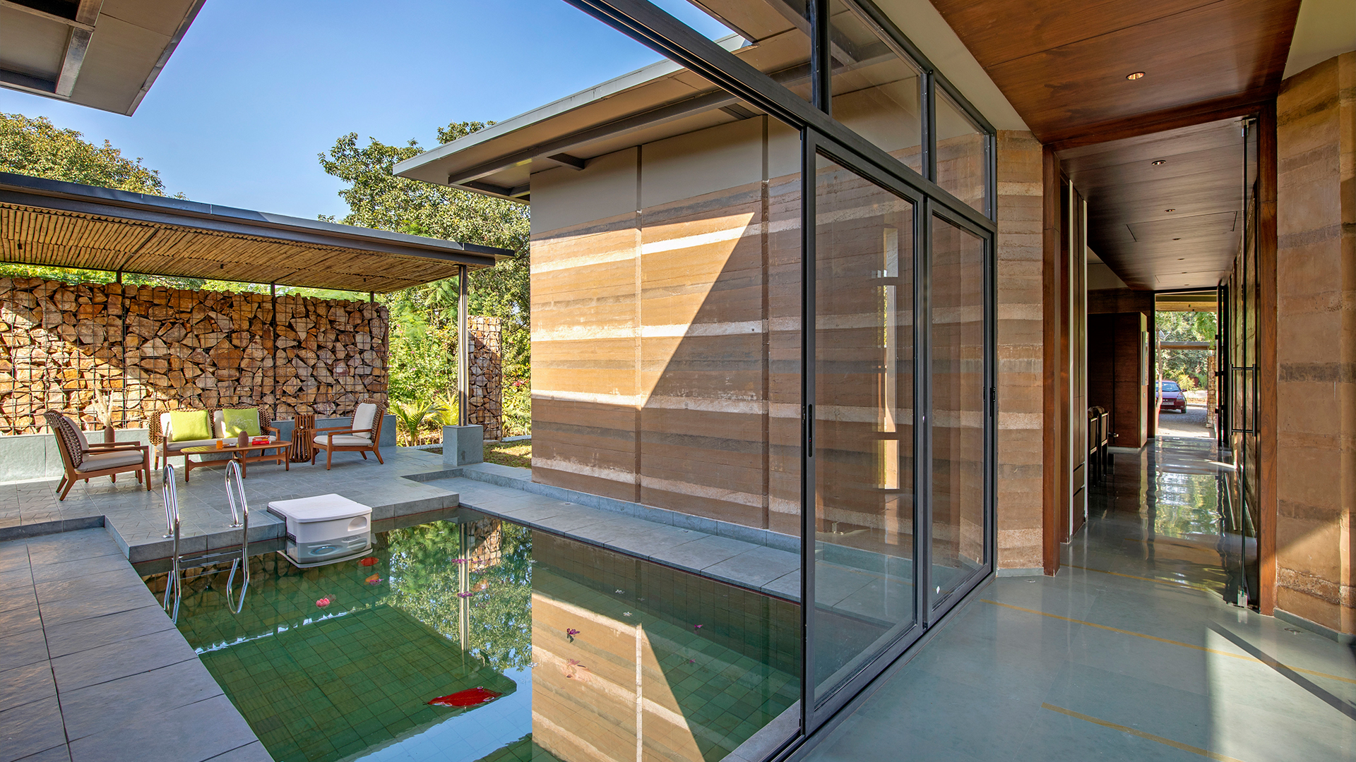 The thick earthen walls act as natural thermal insulation, reducing solar heat gain and maintaining interior temperatures approximately 7–10 degrees cooler than the outside tropical climate. The compact 3000 sq. ft. residence is planned with a simple layout consisting of three bedrooms and a central living space, complemented by outdoor leisure areas including a pool and gazebo that strengthen the connection between indoor and outdoor environments.